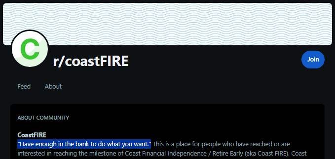 This is exemplified by coastFIRE. Instead of saving enough to fully retire, they save enough so that they can “coast” — work part-time, or at a less lucrative (but more fulfilling) job.
