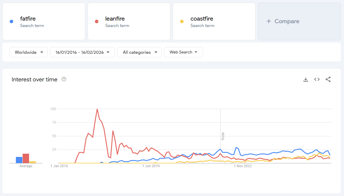 Interestingly, leanFIRE started the most popular, then fatFIRE, and now coastFIRE is gaining steam.
